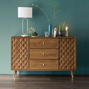 Chest of drawer made of mdf board with stain finish Front: 3D mdf board with stain finish Structure: mdf board with stain finish Legs: Brushed steel with powder coating Size: 140 W x 40 D x 75 H (All dimensions… -